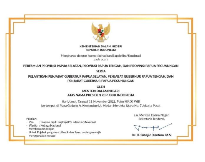 Rencananya, Kemendagri akan meresmikan tiga provinsi DOB Papua serta melantik Pj Gubernur Provinsi Papua Selatan, Papua Tengah, dan Papua Pegunungan.